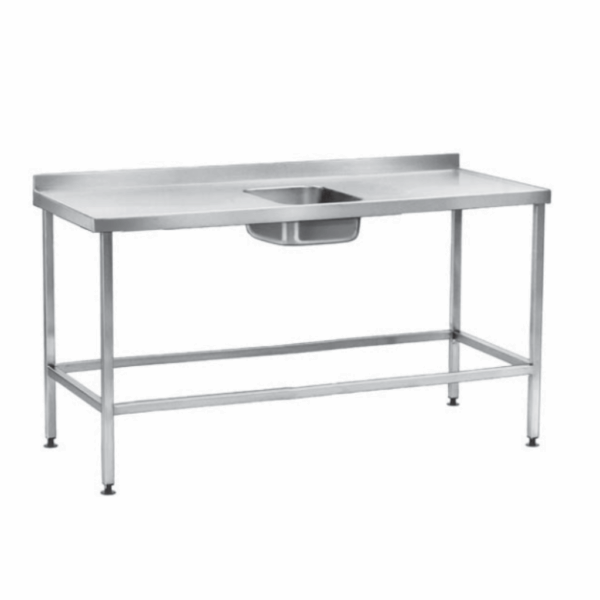 Bänkskivan tillverkas av rostfri slipad 1,2 mm plåt med 60 mm hög uppdragen bakkant och rundad 15 mm
